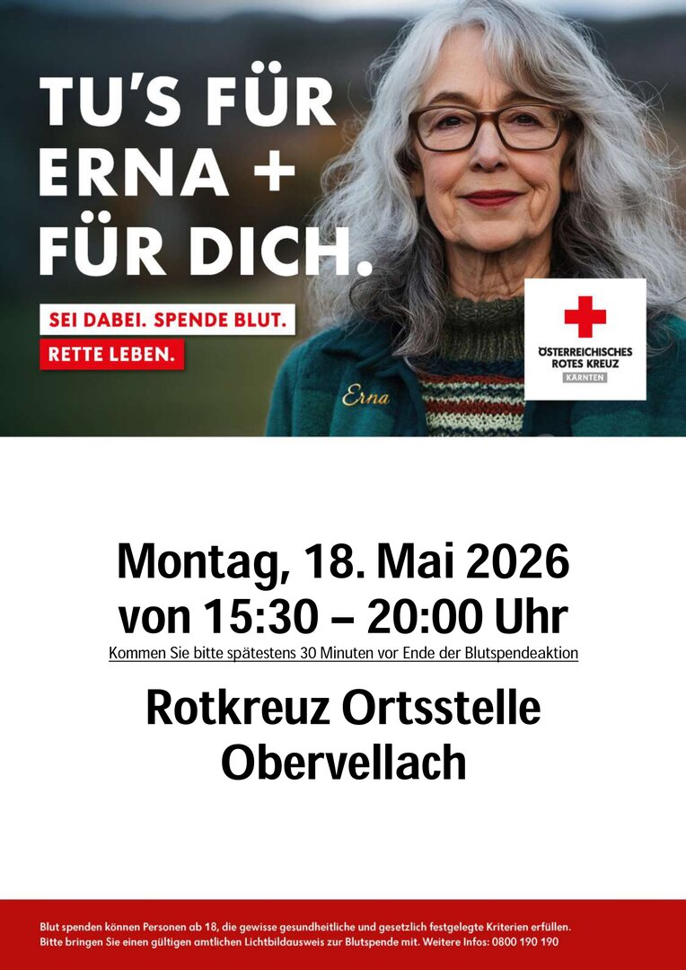 Die Bevölkerung von Obervellach und Umgebung wird gebeten, sich zahlreich an dieser Blutspendeaktion zu beteiligen.