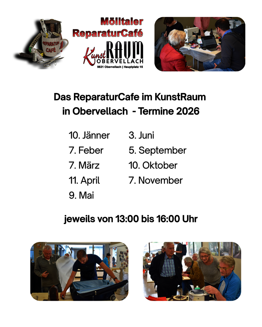 Im KunstRaum Obervellach können zu den angegebenen Terminen von 13:00 bis 16:00 Uhr kaputte Gegenstände repariert werden – ganz nach dem Motto „Reparieren statt Wegwerfen“.