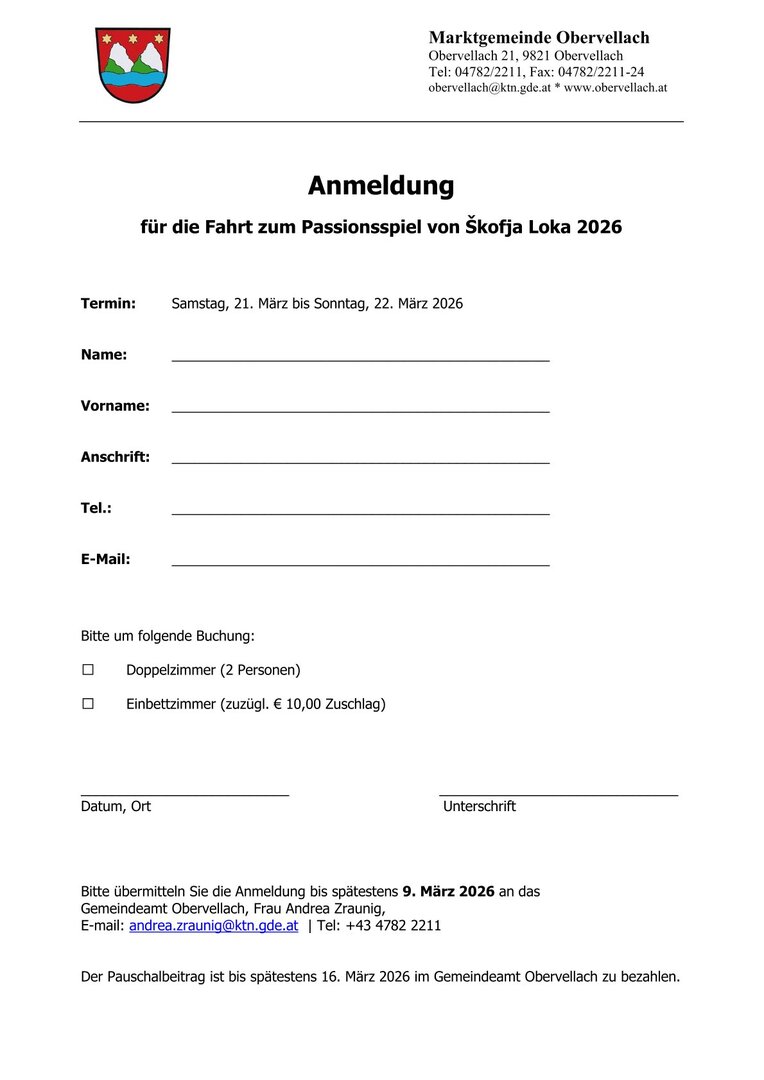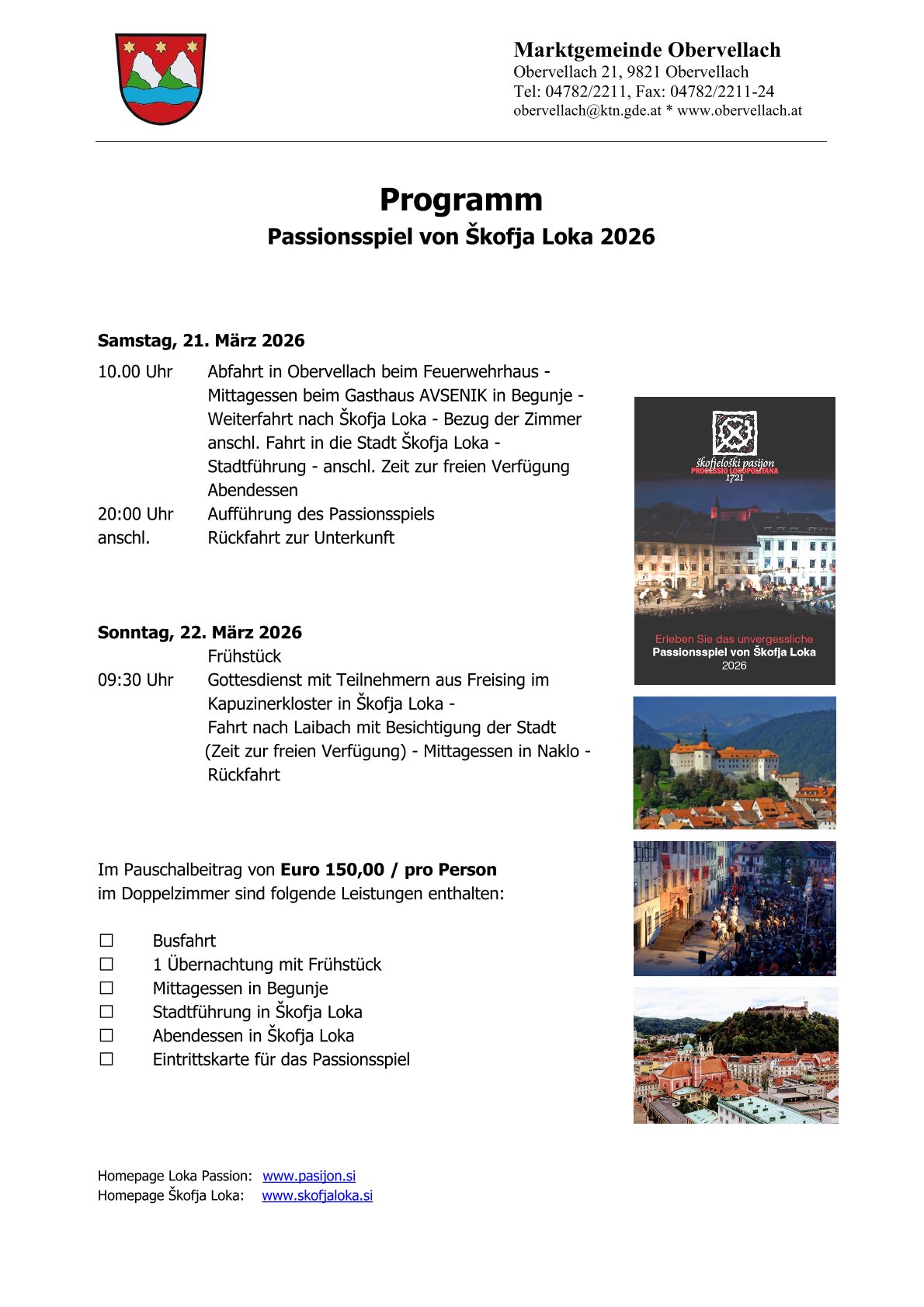 Die Marktgemeinde Obervellach organisiert von Samstag, 21. März bis Sonntag, 22. März 2026 eine Fahrt zu den Passionsspielen in unsere Partnerstadt Škofja Loka.