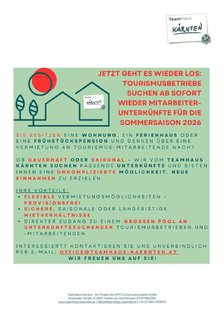 Wir vom TEAM HAUS KÄRNTEN vermitteln seit 2023 kostenfrei Unterkünfte an Tourismusbetriebe. Mit unserer Plattform www.teamhaus-kaernten.at bringen wir Vermieter und touristische Arbeitgeber unkompliziert zusammen.