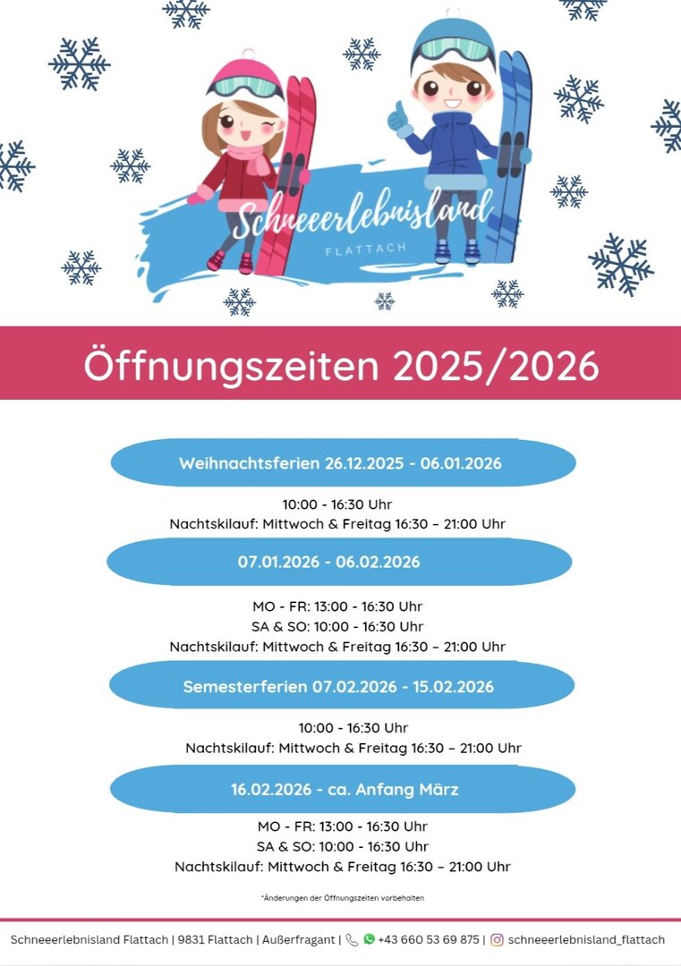 Aktuelle Öffnungszeiten finden Sie auf der Homepage der Gemeinde Flattach und auf Facebook vom Schneeerlebnisland Flattach