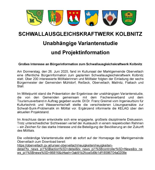 Zu dem geplanten Schwall-Ausgleichskraftwerk Kolbnitz liegt die "Machbarkeitsstudie zur Bewertung und Minderung der Auswirkungen von Schwallbelastungen an der Möll" vor.