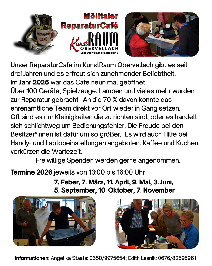 Reparieren statt wegwerfen. Seit April 2023 gibt es das ReparaturCafe Obervellach, wo ehrenamtliche Handwerkerinnen – Tischler, Elektrotechniker, Schneiderin, Uhrenmacher und Alleskönnerinnen - gemeinsam mit den Besitzer*innen verschiedenste Dinge wieder instand setzen. Oft sind es nur kleine Defekte, die schnell behoben werden können. Das Team hilft zudem beim Reparaturbonus, unterstützt ältere Menschen und bietet Hilfe bei Handy- oder Laptop-Einstellungen.
