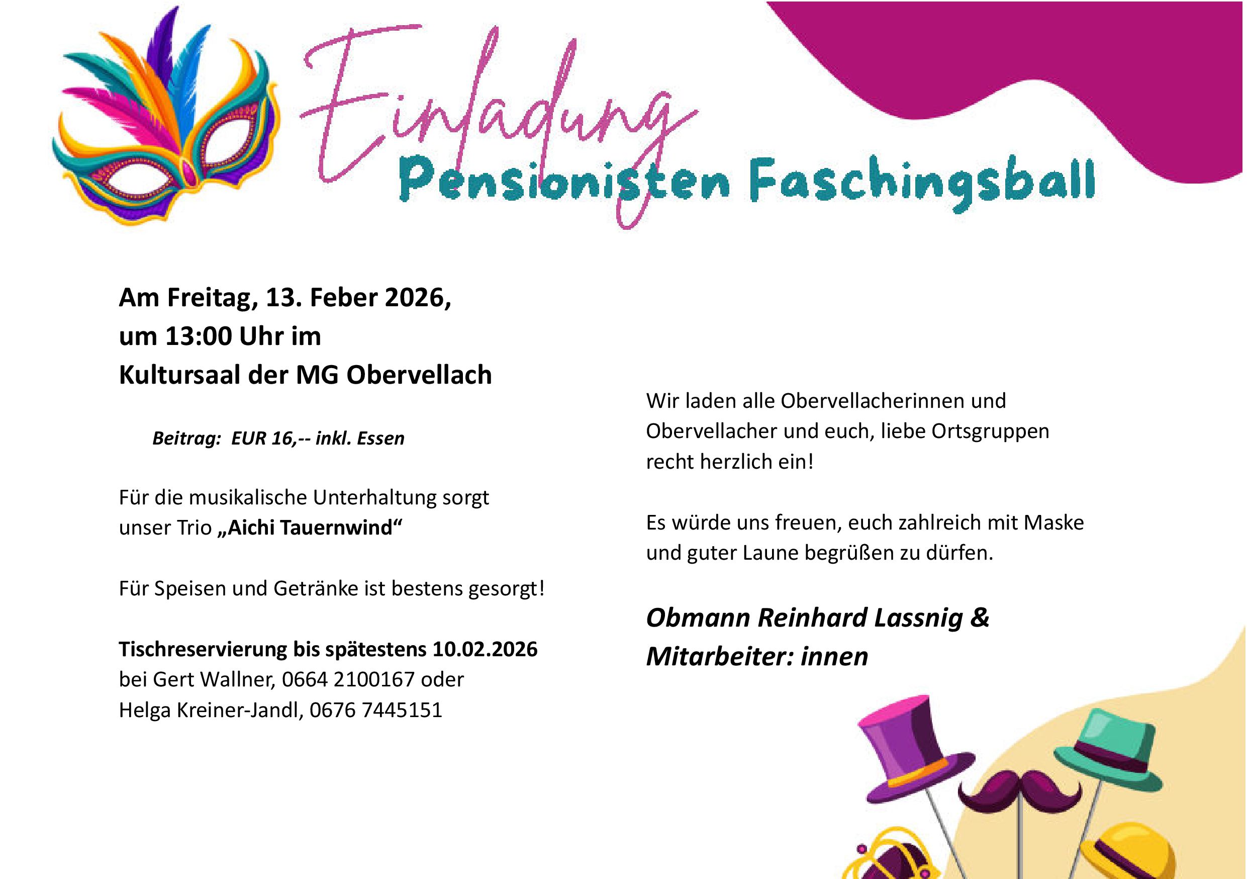 Zum Faschingsball mit musikalischer Unterhaltung vom Trio “Aichi Tauernwind” wird eingeladen.