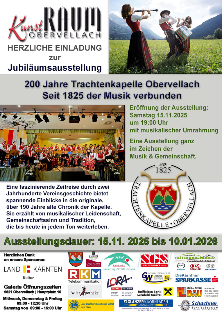 Nach dem Streetfood & Musikfest am Hauptplatz sowie dem Kirchtag im November folgt der krönende Abschluss des Jubiläumsjahres im Kunstraum Obervellach. Dort wird die Geschichte der Trachtenkapelle lebendig: Eine sorgfältig geführte Chronik, ergänzt durch Originaldokumente und historische Fotos, erlaubt tiefe Einblicke in die Entwicklung des Vereins. Auch ehemalige Kapellmeisterinnen und Kapellmeister sowie Ehrenmitglieder, die den Verein geprägt haben, finden in der Ausstellung ihren Platz.